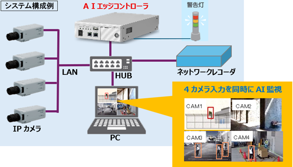 この装置は、IPカメラ(max4台)と組み合わせる事で、リアルタイムでのAI画像認識による
